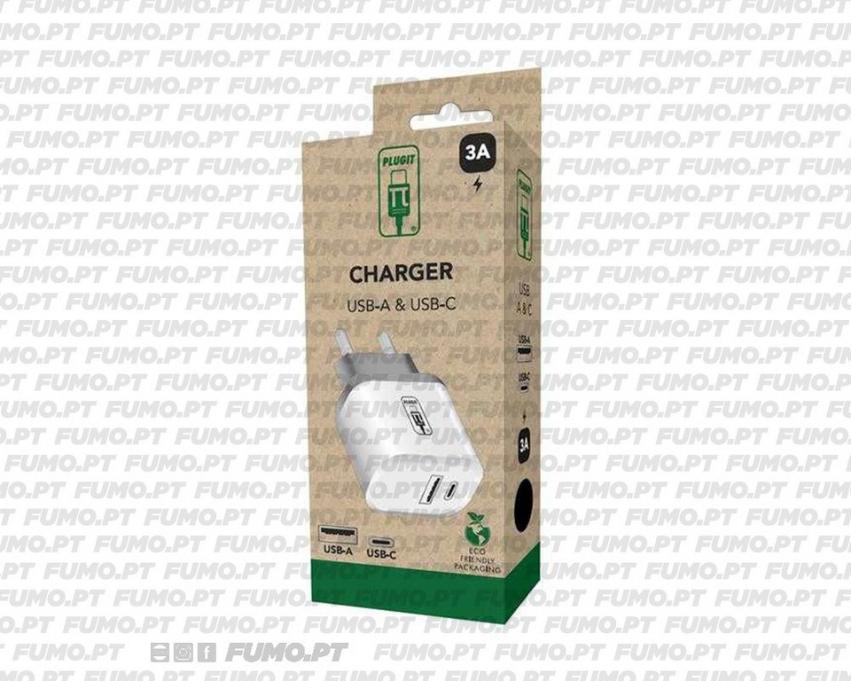 Carregador Parede com 1 porta USB-A + 1 porta USB-C – 5V / 3A Marca: Plugit